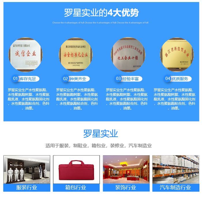 羅星實業總公司生產水性聚氨酯,聚氨酯乳液,水性pu,水性聚氨酯分散體,皮革表面處理及涂飾,水性合成革樹脂,織物涂層,印花,整理,無溶劑聚氨酯,合成革面料熱熔膠,水性木器漆,金屬漆,油墨,塑膠,水性粘合劑,水性復合膠,水性鞋膠,水性植絨膠,水性吸塑膠,水性磁卡膠,水性油墨,油性油墨,水性色漿,染料水,有機硅,流平劑,潤濕劑,滲透劑,涂飾手感劑,合成革助劑,溶劑型織物涂層膠{防水透濕}生產與批發。